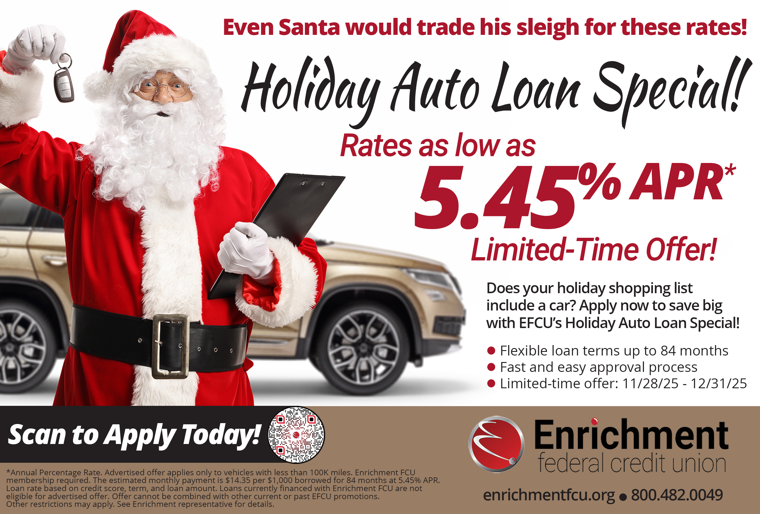 There’s never been a better time to hit the road in style—and save while you do it! From November 28 through December 31, 2025, take advantage of our limited-time Auto Loan Special featuring rates as low as 5.45% APR*.